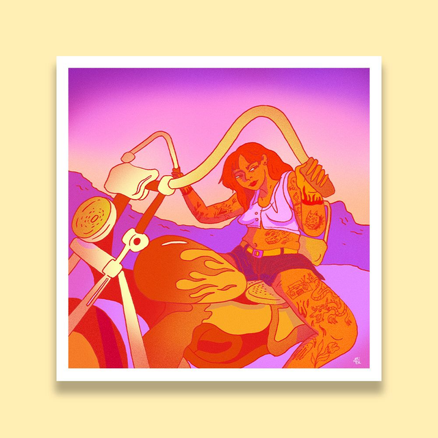 Illustration réalisée sur procreate d'une jeune femme sur une moto en plein road trip.